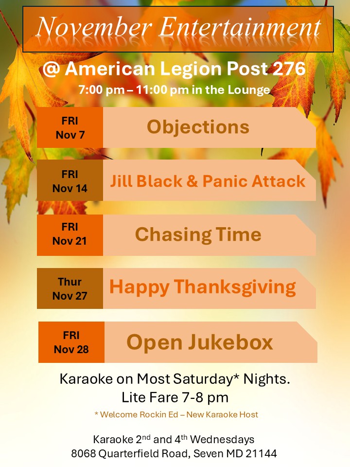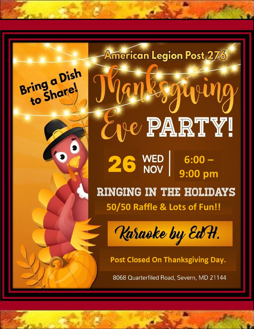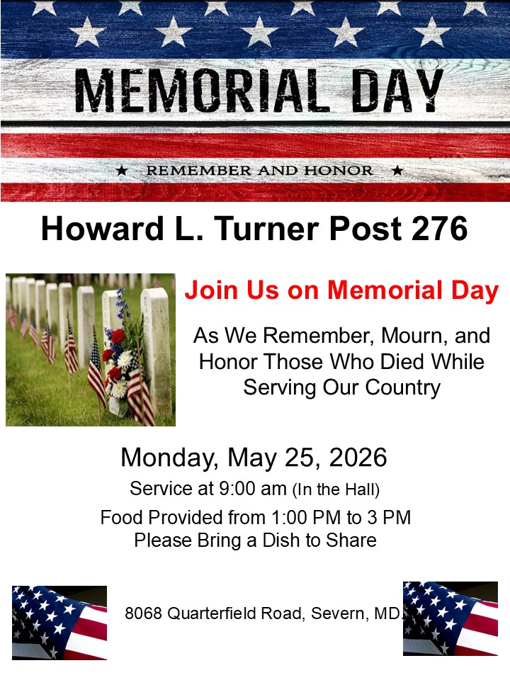 Founded in 1956, The Howard L. Turner Post 276 of the American Legion is located in Severn Maryland. The post was named after Private First Class Howard L. Turner raised near the town of Severn Maryland. PFC Turner was Killed in Action while fighting the enemy in South Korea on March 31, 1951.
