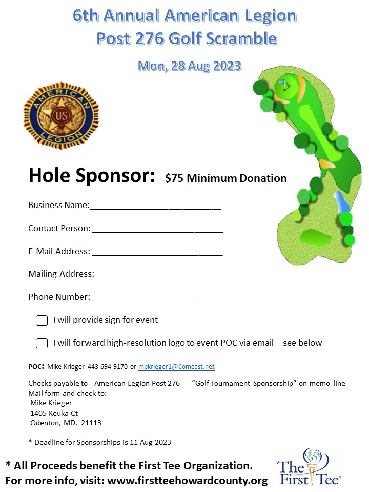 The 6th Annual American Legion Post 276 Golf Invitation will be held on Monday, August 28, 2023, at the Crofton Country Club, Crofton MD